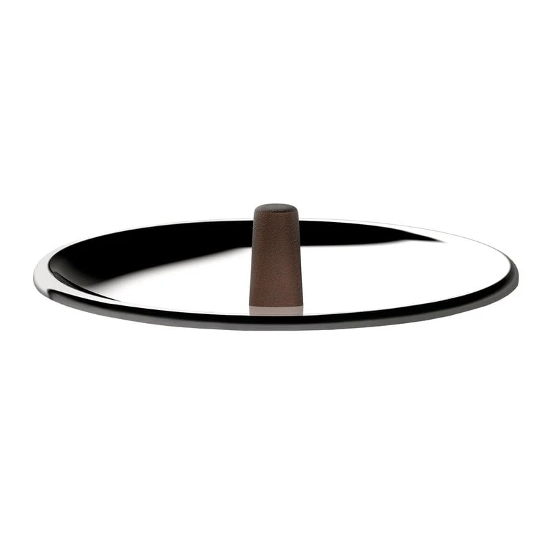 Der von Patricia Urquiola für Alessi entworfene Deckel Edo ist aus rostfreiem Stahl und mit einem braunen, polierten Griff versehen. Dank der konkaven Form können Sie Löffel und Kellen einfach auf dem Deckel ablegen.