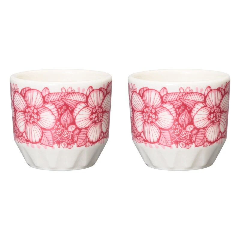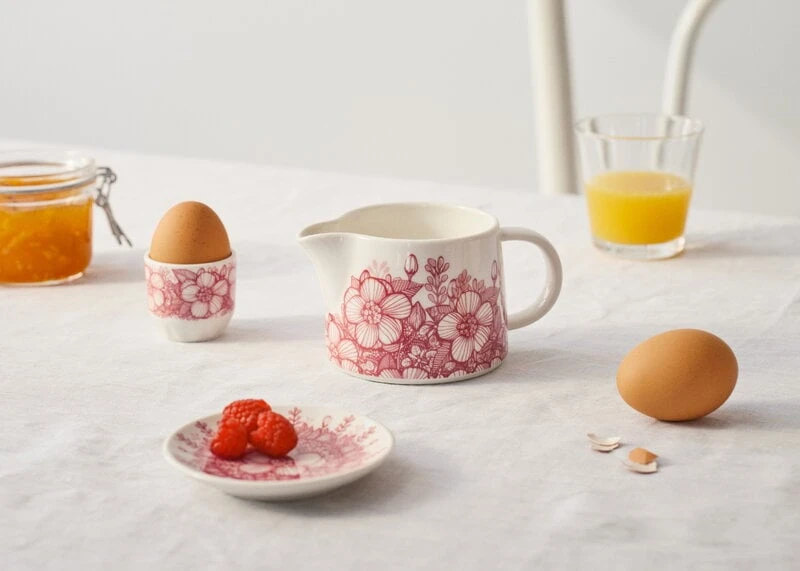 Der Huvila-Eierbecher von Arabia ist mit zarten, von Heini Riitahuhta gezeichneten, rosa Blumen geschmückt. Huvila ist finnisch für Villa. Das nostalgische Blumenmuster verströmt die Atmosphäre warmer Sommer in der Kindheit bei Oma. Mit Design-Einflüssen aus den 1920er Jahren führt die zeitgenössische Huvila-Kollektion die Dekorationstradition von Arabia auf charmante Weise weiter.