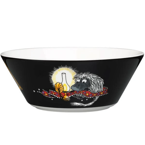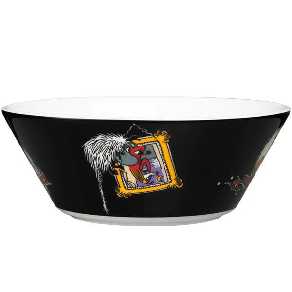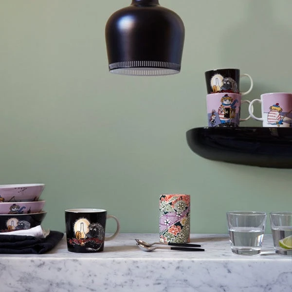 Arabias Schüssel Ahne in Schwarz zeigt einen seltsamen Vorfahren der Mumins, der in ihrem Haus hinter dem Kachelofen lebt. Die haarige, nachtaktive Kreatur hat die Angewohnheit, ihre Stube neu zu dekorieren, indem sie Bilder auf den Kopf stellt. Die Mumin-Schalen aus Keramik heitern jeden gedeckten Tisch auf und eignen sich mit ihrem schlichten Design hervorragend zum Servieren von Suppen, Müsli und auch Desserts.