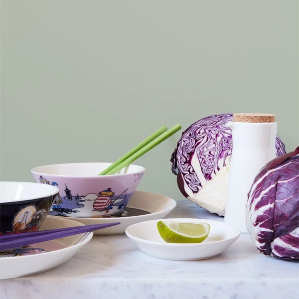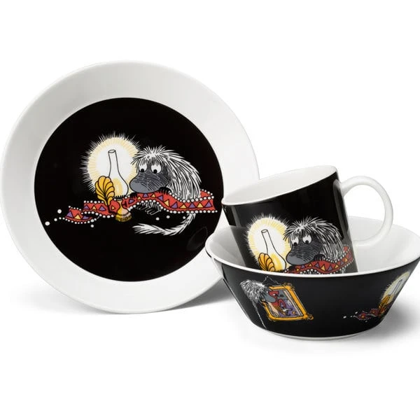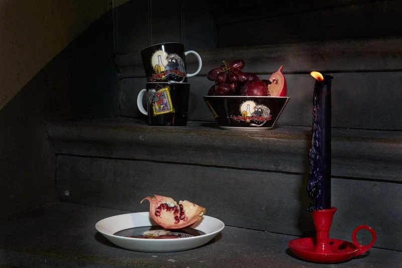 Die Tassen, Schalen und Teller der Geschirrkollektion Mumin Classics von Arabia zeigen die Figuren des Mumintals von vorne und hinten. Die ersten Stücke des Mumin-Geschirrs von Arabia kamen bereits in den 1950er Jahren heraus, und die Großproduktion begann 1990. Alle Illustrationen stammen von Tove Slotte, die sich von den Originalzeichnungen von Tove Jansson inspirieren lässt. Die Form der Kollektion stammt vom zeitlosen Teema-Keramikgeschirr von Arabia, welches von Kaj Franck entworfen wurde.