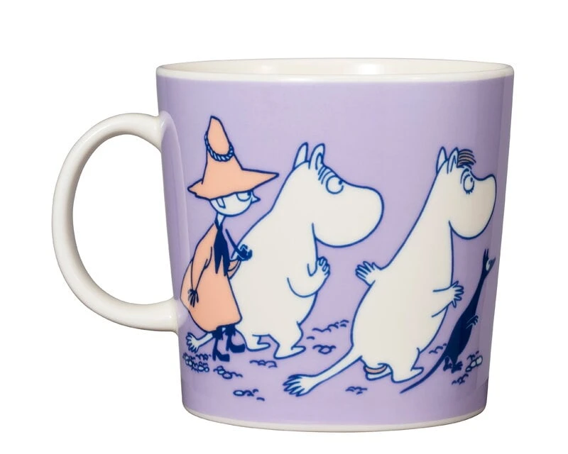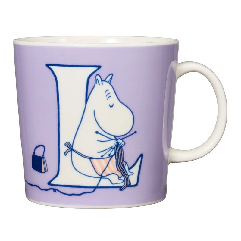 Die Mumin-ABC-Tassen sind mit niedlichen Initialen und verschiedenen Mumin-Figuren verziert. Die L-Tasse zeigt Muminmutter, die beschlossen hat, mit Muminvater in einer Höhle zu wohnen. Als die Kinder sie jedoch finden, willigen sie ein, zurück ins Muminhaus zu ziehen. Die Illustration auf der anderen Seite der Tasse stammt aus dem Comic Mumins Familienleben.