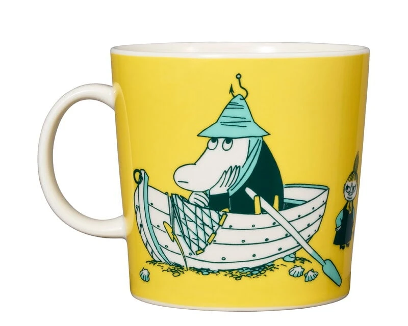 Die Mumin-ABC-Tassen sind mit niedlichen Initialen und verschiedenen Mumin-Figuren verziert. Die O-Tasse zeigt Mumin, der sich auf eine Expedition begibt, um mehr über die drohende Katastrophe im Mumintal herauszufinden. Die Illustration auf der anderen Seite der Tasse stammt aus dem Comic Mumin und der Komet.