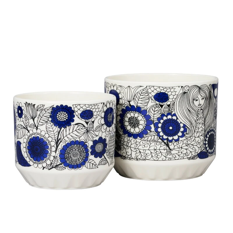 Der Pastoraali-Blumentopf von Arabia ist mit einem im Jahr 1965 von Esteri Tomula entworfenen organischen Muster verziert. Pastoraali, das menschliche Figuren inmitten von Blumen, Blättern und Vögeln zeigt, erstrahlt in tiefem Blau, da die neue Siebdrucktechnik die Verwendung von leuchtenden Farben erlaubte. Die üppigen pastoralen Landschaften wurden auf einen schlicht weißen Keramikblumentopf gedruckt.