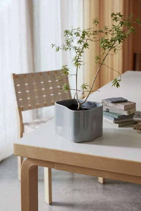 Die Riihitie-Übertöpfe, die Aino Aalto für das Haus der Familie in Helsinki entworfen hat, waren Teil der Kollektion, die die Aaltos 1937 auf der Pariser Weltausstellung präsentierten. 80 Jahre später brachte Artek die keramischen Pflanzgefäße, die nach der Adresse ihres ursprünglichen Aufstellungsortes benannt sind, zur Feier des hundertjährigen Jubiläums der Unabhängigkeit Finnlands auf den Markt. Das organische, wellenförmige Design der handgefertigten Riihitie-Töpfe spiegelt die enge Verbindung von Aalto zur Natur wider.