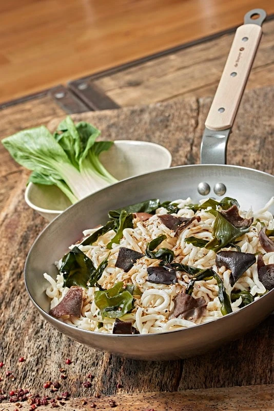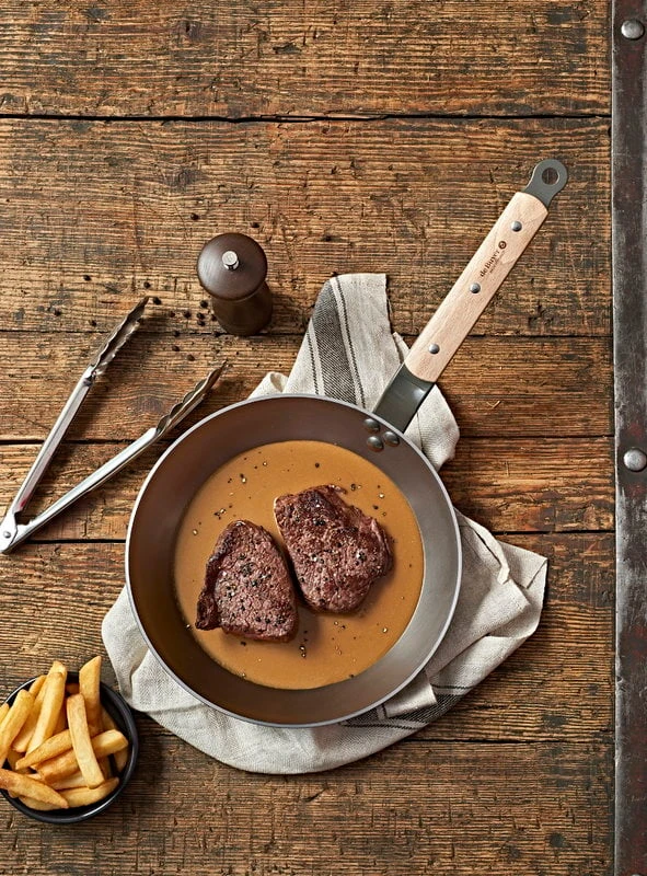 Die robusten und leichten Karbonstahlpfannen halten hohen Temperaturen stand, eignen sich hervorragend zum Karamellisieren von Speisen und bleiben lange heiß. Bei regelmäßigem Gebrauch wird die Pfanne dunkler und entwickelt eine natürliche Antihaft-Oberfläche. Je schwärzer sie wird, desto weniger klebt sie. Zu diesem Zweck kann die Pfanne auch gelegentlich eingebrannt werden. Alle Pfannen aus der Kollektion Mineral B Bois stammen aus französischer Herstellung.