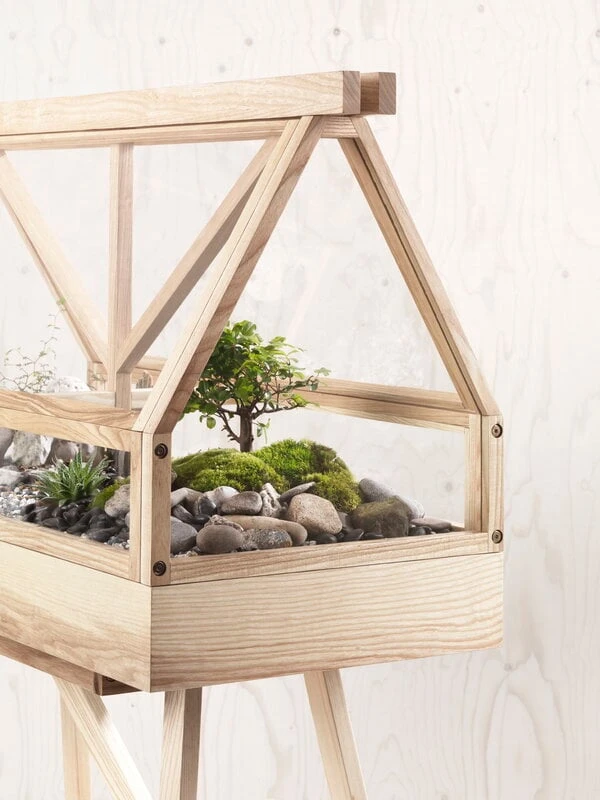 Während ihres Studiums in Schweden ließen sich die Designer von der umgebenden Natur inspirieren und wollten ihr auch im Innenbereich einen Raum schaffen. Das Endergebnis ist ein schönes Objekt aus Esche und Glas, perfekt für grüne Miniaturwelten.