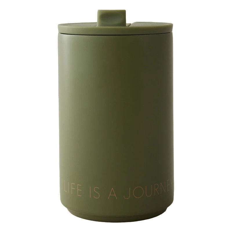 Der isolierte Thermosbecher von Design Letters sorgt dafür, dass Ihre heißen Getränke unterwegs schön warm und Ihre kalten Getränke kalt bleiben! Der nicht schraubbare Deckel lässt sich leicht öffnen und schließen. Bei Bedarf können Sie den Becher zudem auch ohne den Deckel benutzen. Der Thermosbecher ist mit dem minimalistischen und stilvollen Text „Life is a journey“ (dt.: Das Leben ist eine Reise) verziert – ein durch und durch passender Slogan für diese vielseitige Flasche, die sich ideal für das Büro, fürs Pendeln und andere Reisen und Abenteuer eignet!