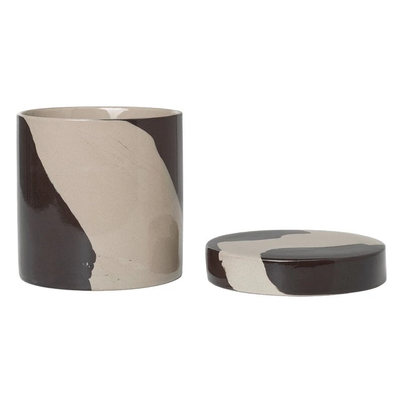 Der Inlay-Behälter von ferm LIVING wird aus zwei verschiedenen Tonarten hergestellt, die ein wunderschönes, einzigartiges, marmorähnliches Muster auf der Oberfläche des Gefäßes bilden. Das Muster ist bei jedem einzelnen Gefäß anders. Der Behälter ist mit einer klaren, glänzenden Glasur versehen und spülmaschinenfest.