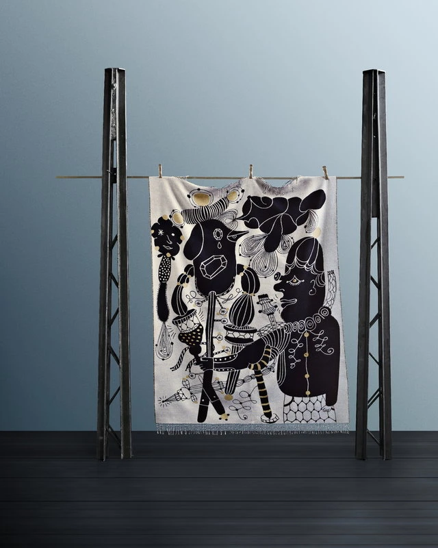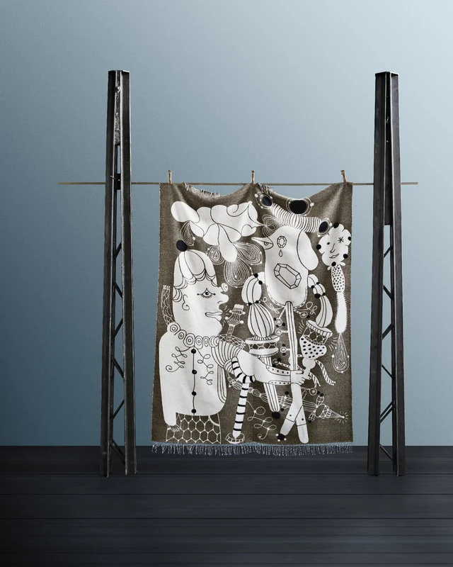 Fritz Hansens Jaime Hayon-Decke ist mit einer skurrilen, detailreichen Illustration des spanischen Designers Jaime Hayón verziert, die sich auf der Rückseite der Decke in entgegengesetzten Farben wiederfindet. Die Decke besteht aus einer hochwertigen Mischung aus Merinowolle, Alpaka und Baumwolle und ist an den Enden mit Fransen versehen.