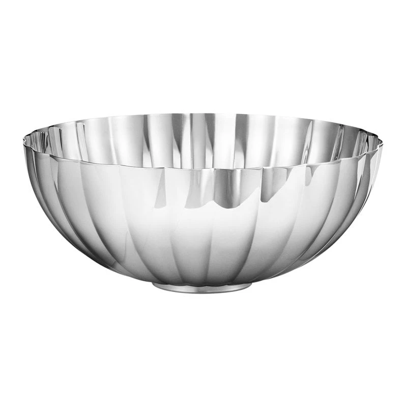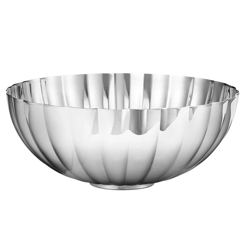Die Bernadotte-Schale von Georg Jensen ist aus Edelstahl gefertigt und mit zarten Rillen verziert. Die große Schale kann zum Beispiel als Salat- oder Obstschale verwendet werden.
