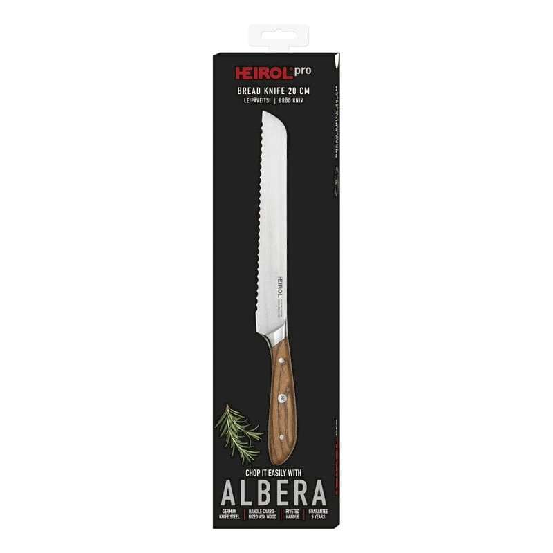 Das Albera-Brotmesser von Heirol ist ein schön gestaltetes Küchenmesser mit einem schönen, traditionellen Holzgriff. Das Messer ist ideal zum Schneiden von Brot, das außen knusprig und innen weich ist.