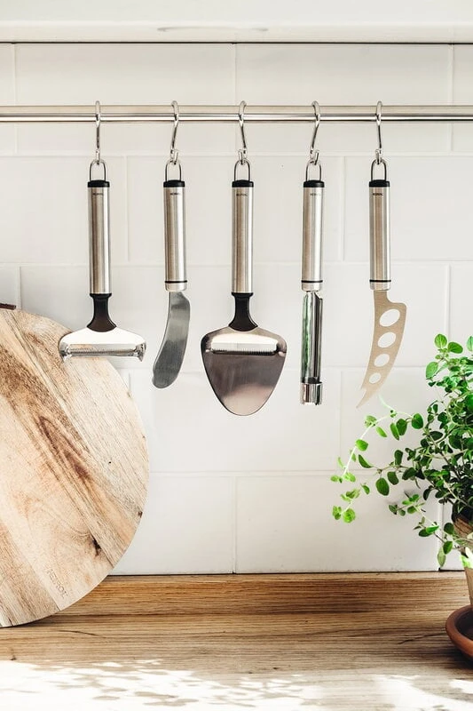 Der Steely-Käsehobel von Heirol ist ein praktisches Hilfsmittel zum Schneiden gleichmäßiger und dünner Käsescheiben. Mit der gezahnten Klinge lassen sich auch härtere Käsesorten leicht schneiden. Der traditionelle Käsehobel ist aus hochwertigem Edelstahl gefertigt und sein Griff ist mit Kunststoff gefüllt, damit kein Schmutz oder Wasser in den Griff eindringen kann. Der langlebige und hygienische Steely-Käsehobel kann problemlos in der Spülmaschine gereinigt werden.