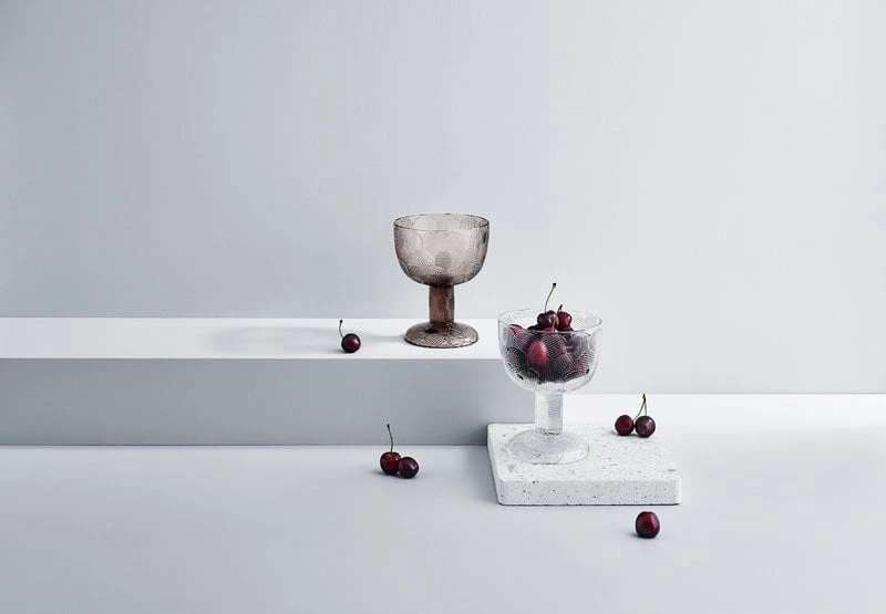 Die Miranda-Schale von Iittala kombiniert eine einfache Schale mit Fuß mit einer detaillierten, strukturierten Verzierung, die das Licht auf einzigartige Weise reflektiert. Die Schale aus gepresstem Glas ist in einer Reihe schöner Farbtöne erhältlich; entscheiden Sie sich für eine einzelne Servierschale für Snacks oder beeindrucken Sie Ihre Dinnergäste, indem Sie den Tisch für das Dessert mit Miranda-Schalen decken. Die Miranda-Schale ist ein Entwurf von Heikki Orvola.