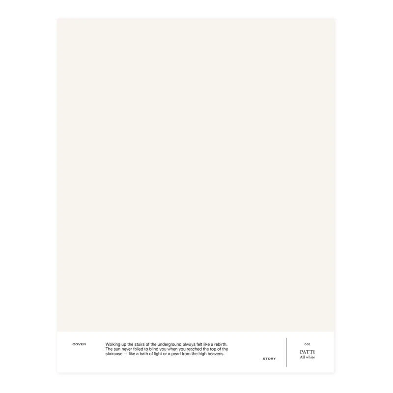 Die Innenfarbe von Cover Story im Farbton 001 Patti ist ein schönes, leuchtendes Weiß, dessen Farbton ein wenig heller ist als Papierweiß. Der weiche Farbton macht den Raum hell und frisch, aber keineswegs kalt. Die matte Farbe erzeugt ein glattes, nicht reflektierendes Finish.