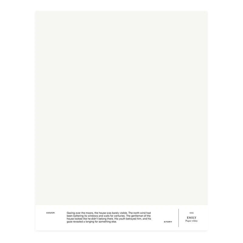Die Innenfarbe im Farbton 002 Emily ist die Interpretation des klassischen Papierweiß der finnischen Farbenmarke Cover Story und passt perfekt zu Fußleisten und Türen. Die mattglänzende Farbe sorgt für ein glattes, samtig-mattes Finish.