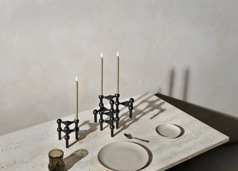 Das dänische Unternehmen STOFF Copenhagen hat den eleganten Kerzenständer STOFF Nagel neu aufgelegt, den der Architekt Werner Stoff in den 1960er Jahren für den Metallarbeiter Hans Nagel entworfen hat. Die Idee für den Kerzenständer kam Nagel, nachdem er bei einem Skiurlaub in den Alpen in den Schnee gestürzt war – aus den drei Fingerlöchern im Schnee entstand später die dreieckige Form von STOFF Nagel. Die modularen Kerzenständer lassen sich zu schönen, skulpturalen Konstruktionen kombinieren, die mit und ohne Kerzen zum Blickfang werden.