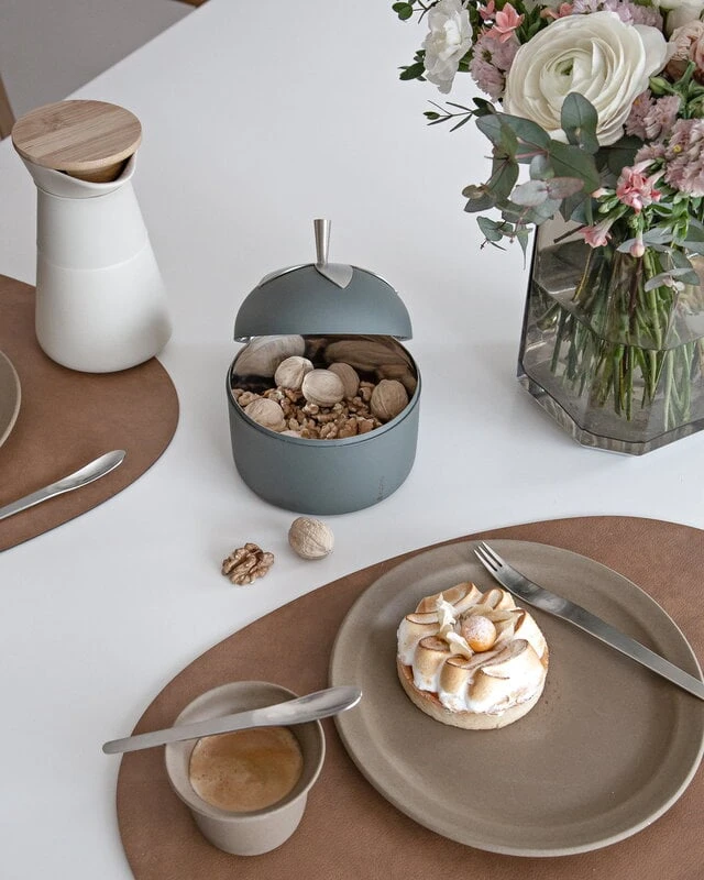 Das Blad-Gefäß von Klong ist mit einem charmanten Blattdekor verziert. Das von Eva Schildt entworfene Gefäß aus Stahl eignet sich perfekt zur Aufbewahrung von Kaffee, Tee oder Zucker; ohne Deckel kann das Gefäß zum Servieren verwendet werden. Das Blad-Gefäß wird mit einem hübschen kleinen Löffel zum Abmessen oder Servieren geliefert.