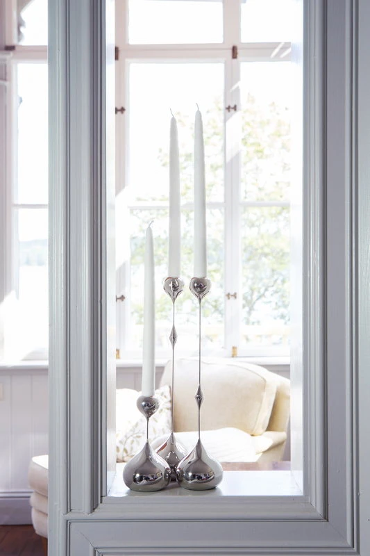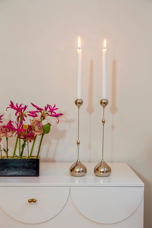 Das Design des Tender-Kerzenhalters von Klong zeichnet sich durch seine zarte Silhouette aus, die einen Kontrast zu den prallen tropfenförmigen Details bildet. Die Designerin Charlotte von der Lancken ließ sich für den schlanken Look von Tender von den Skulpturen des Schweizer Künstlers Alberto Giacometti inspirieren. Die Designerin ließ sich auch davon inspirieren, wie Gegenlicht die Umrisse eines Objekts verblassen lässt. Die vernickelten Kerzenhalter aus Messing sind in verschiedenen Größen erhältlich, wobei die dekorativen Tropfen in unterschiedlichen Höhen platziert wurden.