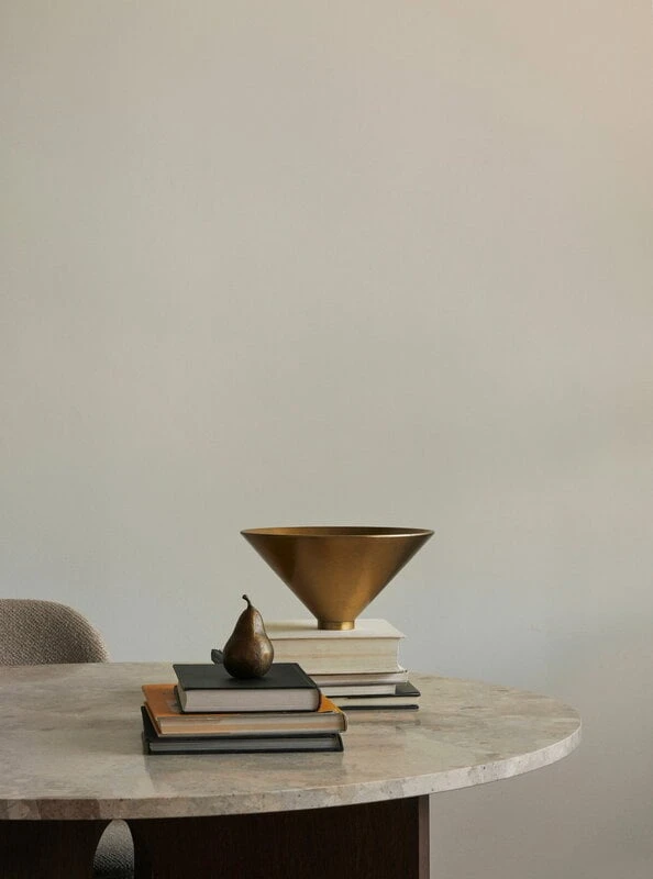 Die Taper-Schale von Menu mit ihrer symmetrischen Erscheinung und wunderschönen messingfarbenen Oberfläche verleiht jeder Einrichtung eine luxuriöse Note. Die kegelförmige Schale kann als Obstschale in der Küche verwendet werden, rundet aber auch die Einrichtung des Wohn- oder Schlafzimmers als interessantes Ornament für sich allein oder als kleine Aufbewahrungsbox ab, um darin winzige Schätze zu verstecken.
