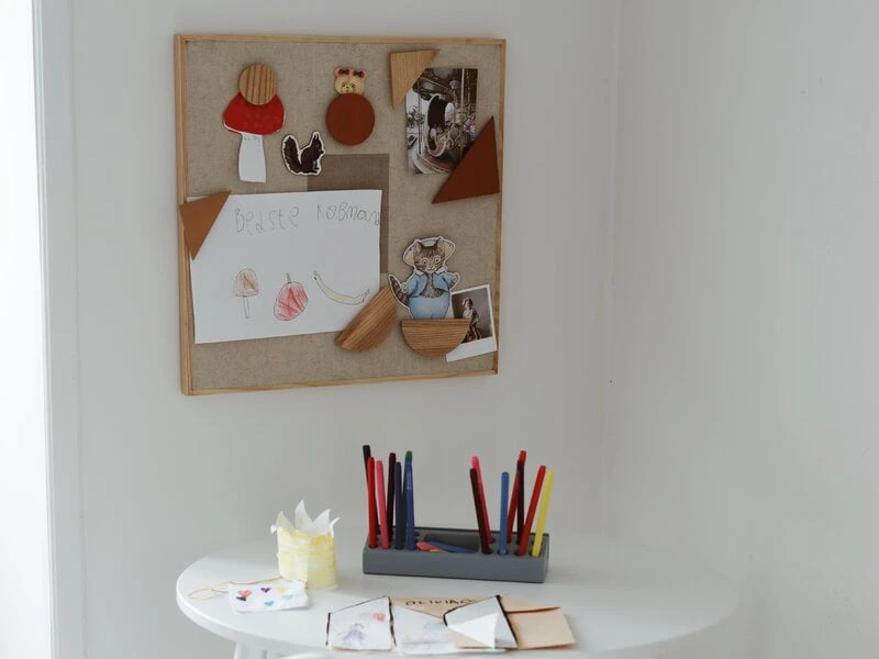 Die Pinnwand von Nofred ist eine hübsche, minimalistische Memo-Tafel für das Kinderzimmer. Sie eignet sich perfekt, um die Kunstwerke der Kleinen, den Stundenplan oder Fotos von Freunden und Familie aufzuhängen. Die Tafel wird mit drei Magneten aus Eschenholz geliefert, von denen zwei mit ungiftigen Farben in erdigen Brauntönen bemalt sind. Die von John Astbury entworfene Pinnwand besticht durch einen minimalistischen, zeitlosen Look, wodurch sie sich auch ideal für andere Räume in Ihrem Zuhause eignet.