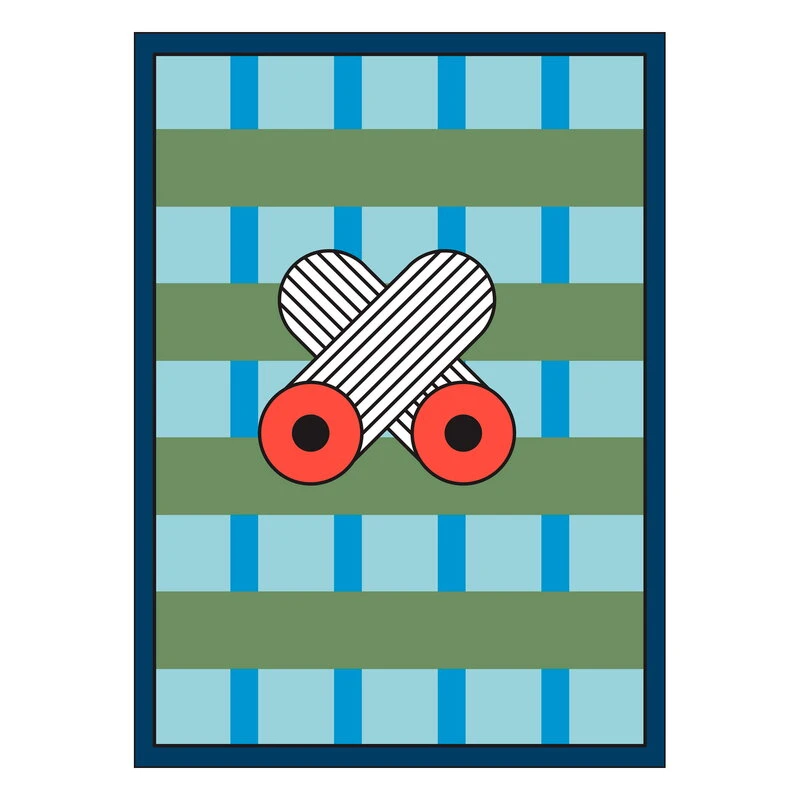Das Poster Caldo von Nathalie Du Pasquier zeigt geometrische Formen in Kombination mit kräftigen, markanten Farbtönen. Die abstrakten Elemente bilden eine Struktur, die jedoch nicht dreidimensional nachgebaut werden kann. Die sichtbaren Striche auf den Farbblöcken verleihen dem Plakat Tiefe und machen deutlich, dass das Originalwerk trotz seiner präzisen Geometrie nicht digital erstellt wurde.