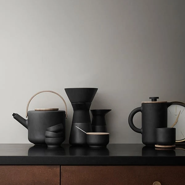 Steltons Teetasse Theo besteht aus dunklem, rustikalem Steingut. Die Innenseite wurde mit einer glänzenden Glasur beschichtet, die einen schönen Kontrast zur schwarzen, matten Oberfläche bildet. Der Bambusdeckel dient gleichzeitig als Untersetzer. Die Tasse kann auch zum Servieren von kleinen Vorspeisen, wie Miso-Suppe und Edamame-Bohnen, verwendet werden.