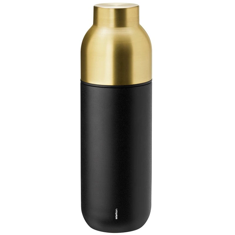 Die Thermoflasche Collar von Stelton bietet eine sichere, stilvolle und ökologische Weise, heiße und kalte Getränke überallhin mitzunehmen. Die leichte Flasche ist aus schwarz beschichtetem rostfreiem Stahl und hat einen messingfarbenen Deckel.